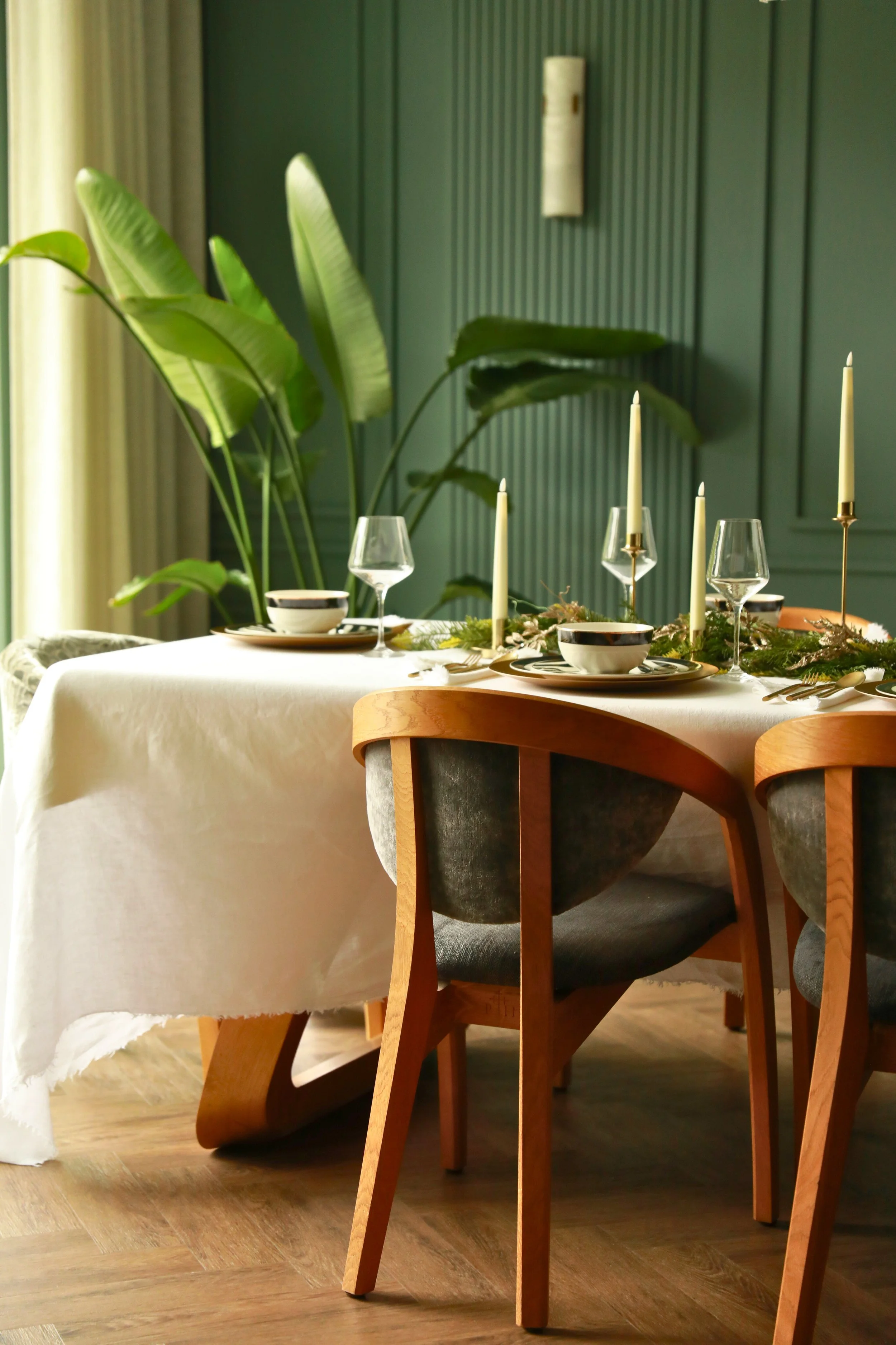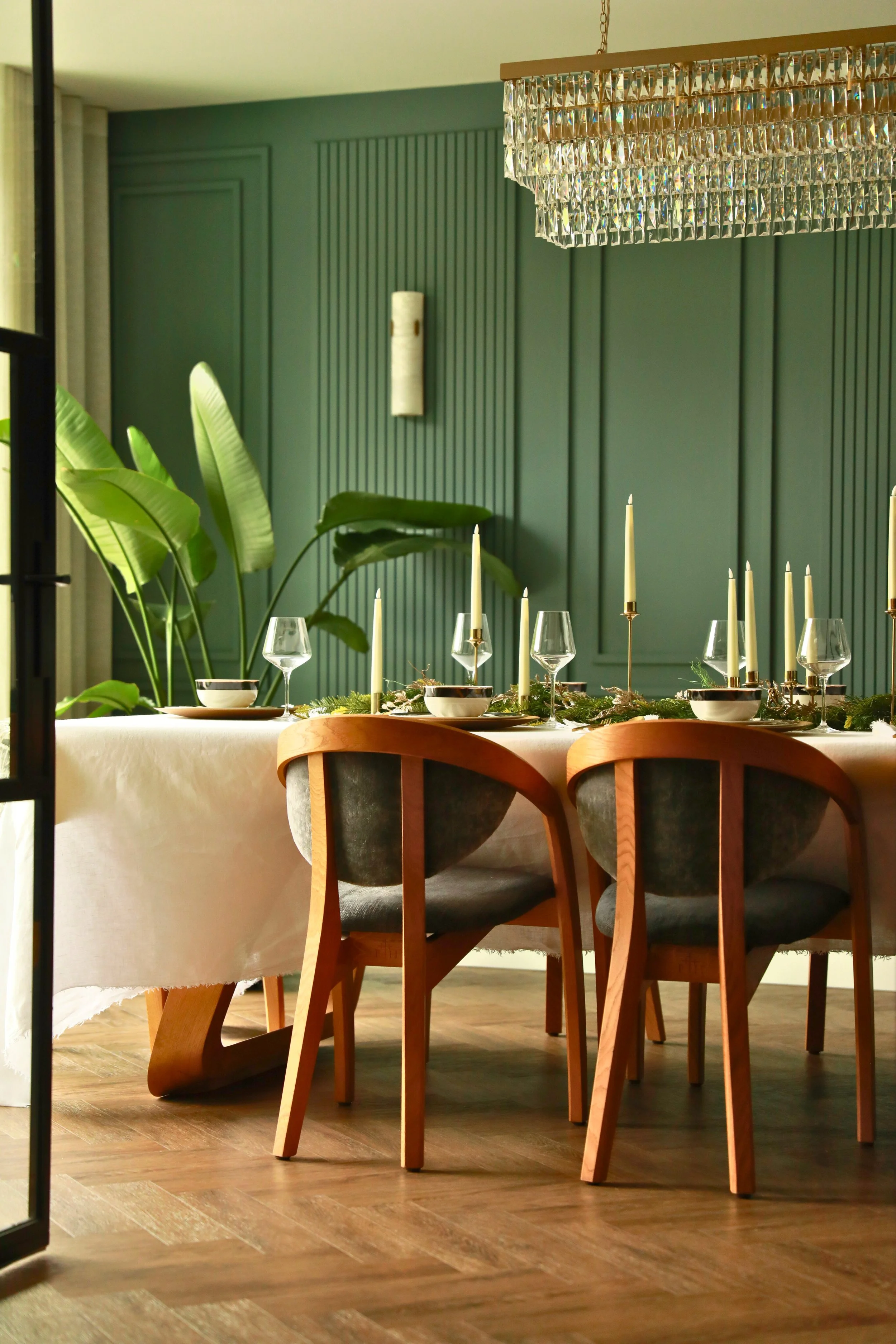 An elegant dining space designed for both everyday gatherings and special occasions. Soft sage-green panelling adds depth and calm, while a statement crystal chandelier brings a touch of glamour. The warm oak tones of the dining chairs and herringbone floor complement the subtle luxury of velvet textures and candlelit details - creating a timeless setting that feels both intimate and elevated.